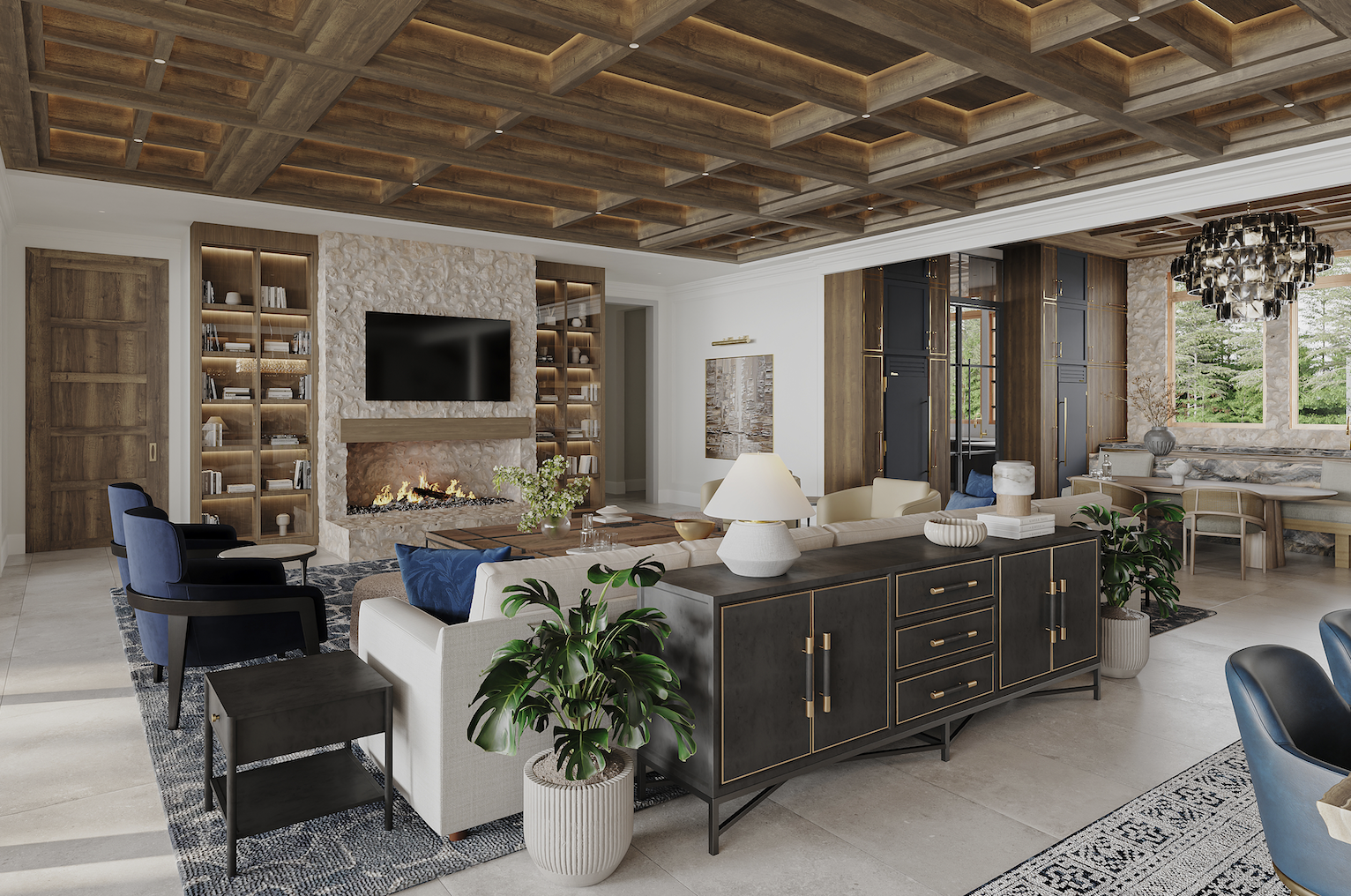 This custom home is a study in contrasts: modern yet rustic, classic yet unapologetically bold. With soaring ceilings ranging from 12 to 14 feet, the scale alone invites drama, and the ceiling details rise to the occasion, echoing the grandeur of a luxury hotel lobby. Every space within the home feels like its own distinct venue in an intimate boutique hotel, each with a unique personality yet woven together into a seamless, cohesive whole.